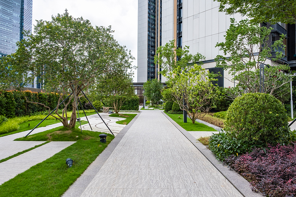 本項目為深鐵閱山境小區(qū)綠化景觀施工項目,位于深圳市南山區(qū),設計風格為現(xiàn)代中式,體現(xiàn)一定的嶺南風情。結(jié)合適地適樹設計原則,主要由大、小喬木、灌木、花草以及地表植被構(gòu)成。其中喬木包括了紫花風鈴木、中國無憂花、叢生丹桂、叢生柚子樹、剛竹等,灌木包括大鶴望蘭、四季桂、米蘭球、銀葉金合歡等,花草包括了比利時杜鵑、藍花鼠尾草、紅花文殊蘭、金邊虎尾蘭等。通過各種花草樹木搭配,豐富景觀層次及色彩,運用群植、團植及孤植的手法,因地制宜地打造不同需求的多元景觀,營造春華秋實的園林景觀,保證了四季有花,可觀花、觀果、觀葉,給小區(qū)住戶營造舒適的景觀生態(tài)環(huán)境。兒童活動區(qū)域場地開闊,各色橡膠地墊即很好地保護了孩子又能達到眼前一亮的視覺沖擊。休閑庭院、景觀廊架周圍有常綠和落葉喬木各種灌木花卉簇擁而成,在形成一個獨立空間之余又能享受到愜意的休閑時光。