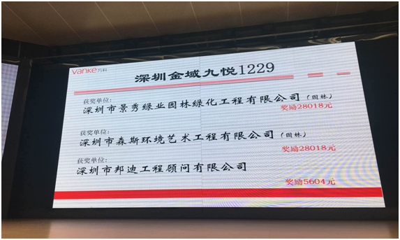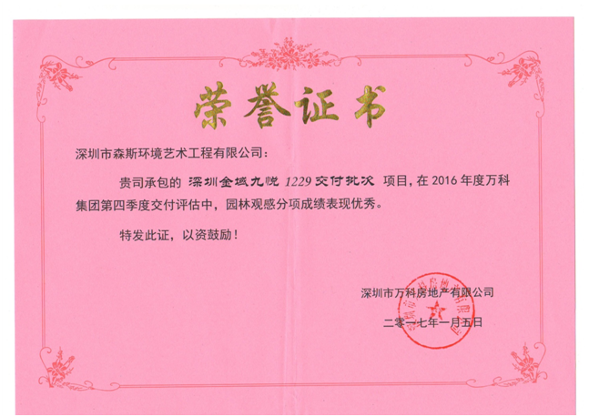 項目位于深圳觀瀾九龍山龍觀快速與悅興路交匯處,項目造價780萬,于2016年4月開工,12月竣工驗收交付甲方使用。萬科地產在2017年1月5日召開的工程系統2016年第四季度暨年度總結大會中,森斯園林以86.9分的成績在整個項目施工單位中排名第一。更值得可喜的是,萬科地產對我單位施工的項目頒發了榮譽證書及獎金,這是對我們工作的肯定,我們將再接再厲爭創品優。