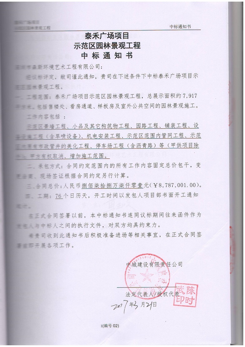 恭喜公司中標泰禾廣場項目示范區(qū)園林景觀工程,項目總價8787001元,總展示面積約7917平方米。包括售樓處、看房通道、樣板房及室外公共空間的園林景觀施工。該工程內(nèi)容包括示范區(qū)景墻工程、小品及其他構筑物工程、園路工程、鋪裝工程、設備設施工程(含旱噴設備)機電安裝工程、示范區(qū)范圍內(nèi)管網(wǎng)工程、示范區(qū)內(nèi)原有市政管井的美化工程、停車場工程(含瀝青路)等。