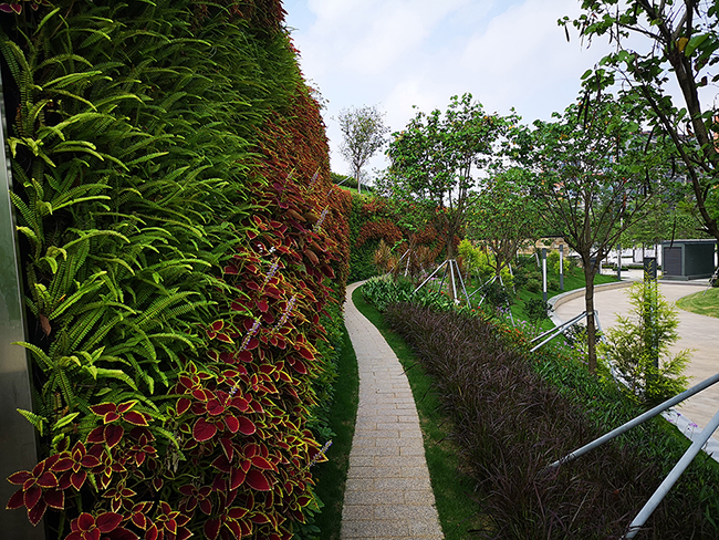 在項目實施中,我們響應上一級規劃理念,以人性化、功能性、以及生態和可持續性原則為核心展開設計與施工,凸顯光明區城市廣場生態、人文、科技三大特色,打造智匯、生態、和諧的廣場面貌。其中特色景觀——山體擋墻立體綠化圖案提取中國傳統文化元素,以鳳凰為原型,擬借鳳凰喜慶、太平、幸福的祥瑞象征,寓意光明區的發展不斷向前推進,像偉大祖國一樣繁榮昌盛、欣欣向榮!