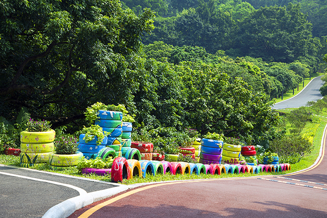 ? 急轉(zhuǎn)彎處放置顏色醒目的輪胎裝置,提醒游人注意安全,體現(xiàn)人性化設(shè)計