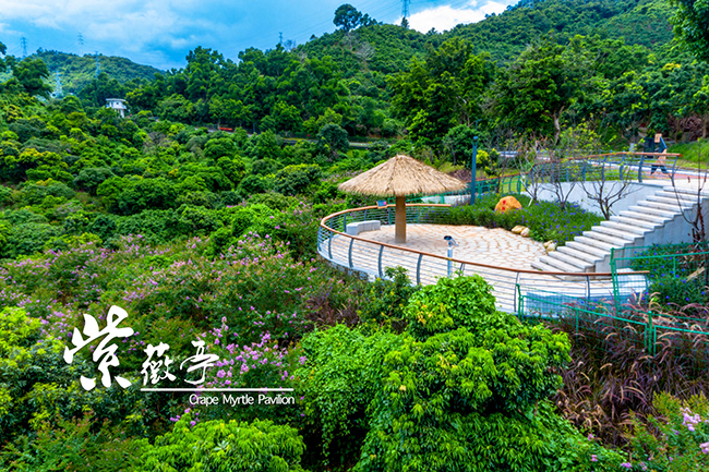 ? 該處為特色茅草亭,因有人在此遍植紫薇,目前已形成一定規(guī)模紫薇花景,故名紫薇亭。