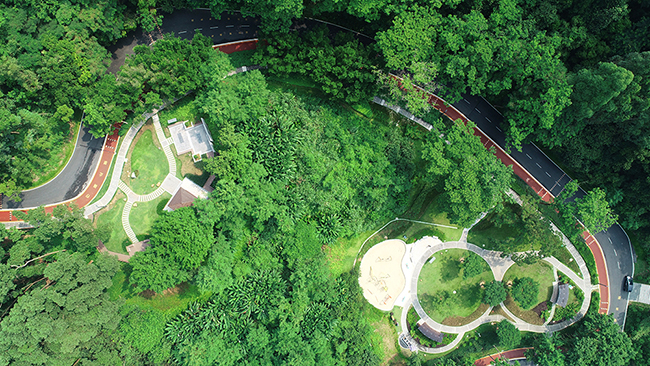 ? 童趣園與思源亭鳥瞰,兩處景點均采用滲透性鋪裝,包含雨水種植池、濾水草帶等一系列雨水鏈設(shè)計 ? 金山亭位于綠道最高點,具有傳統(tǒng)嶺南風(fēng)格,可遠眺深圳水庫和梧桐山的美景,讓人聯(lián)想到“綠水青山就是金山銀山”的理念,金山又暗含淘金山綠道之名。