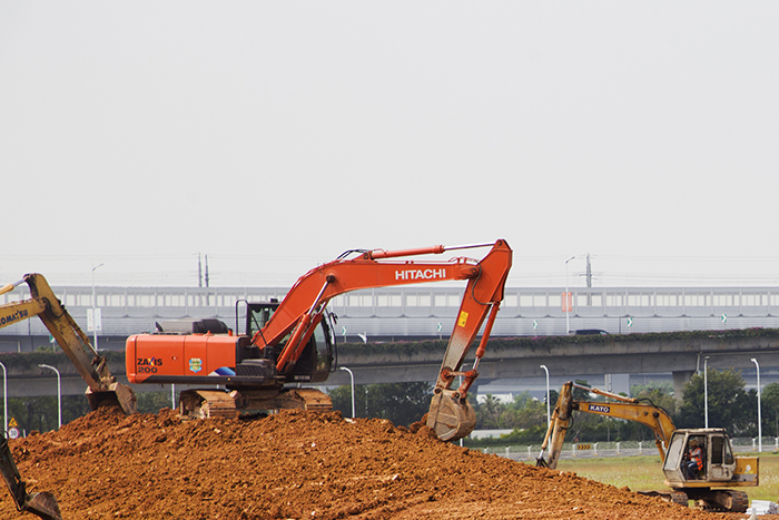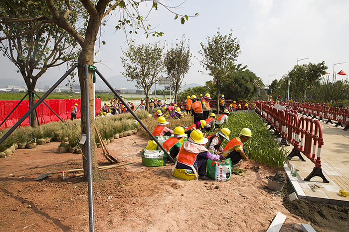 本項目對整個寶安國際機場門戶地區城市環境品質提升工程具有至關重要的領先示范作用,事關品質標準的建立和樣板的打造。森斯環境自項目開工建設以來,即精心組織人員與設備投入其中,為保質保量如期完成,副總經理宋建雄親赴現場督工。據現場施工人員介紹,為實現機場南路北地塊綠地的地形效果,光土方就從異地調配了將近400車次,可見工程量之大。