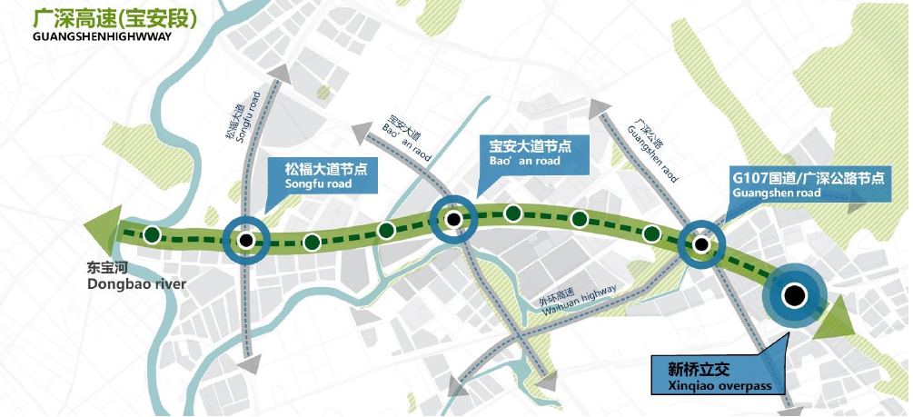 Ⅰ標段,范圍從東寶河-寶安大道前掉頭口(不含寶安大道節點),長度約3.7km。改造內容主要為橋下綠化提升、道路交叉口節點提升、新橋立交節點提升、配套設施完善、廣深高速橋下排水及防拋網等。