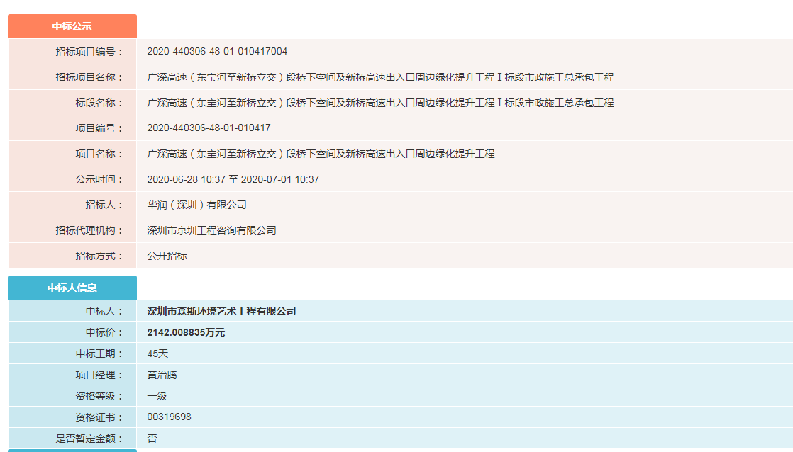 6月28日,深圳市森斯環境藝術工程有限公司中標廣深高速(東寶河至新橋立交)段橋下空間及新橋高速出入口周邊綠化提升工程Ⅰ標段市政施工總承包工程,中標價為2142.008835萬元。工期為45天。