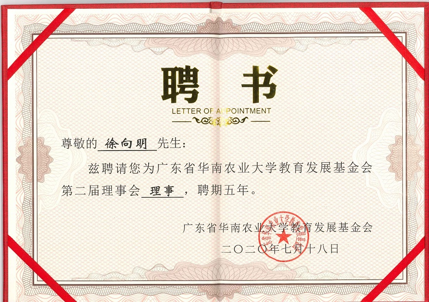華南農業大學聘請徐向明先生為廣東省華南農業大學教育發展基金會第二屆理事會理事,聘期五年。以建設美好生態環境與科研發展為企業追求,森斯環境將與華農大學攜手一同創辦深圳華農生態科研實訓基地,用科研帶動生態環境建設。