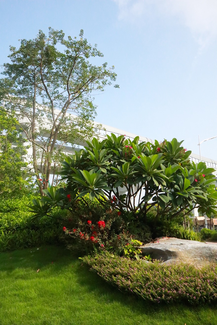 如“歐美小鎮”般的科學城展覽中心,草皮采用的是夏威夷草海濱雀稗 ,是較接近高爾夫球場草地的標準;地形基礎做好后用壓路機壓平,再混入營養土,放沙;生長的草埋入五公分左右,要適當控制其生長,盡可能避免草坪發生高低變化的現象。舊時坑洼的水溝改造成旱溪景觀,與水生植物的搭配形成了一道亮麗的風景。