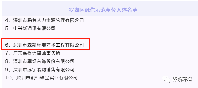根據《關于開展羅湖區誠信示范單位創建活動的通知》,經初審、現場核查和專家評審,深圳市森斯環境藝術工程有限公司(以下簡稱森斯環境)入選羅湖區誠信示范單位