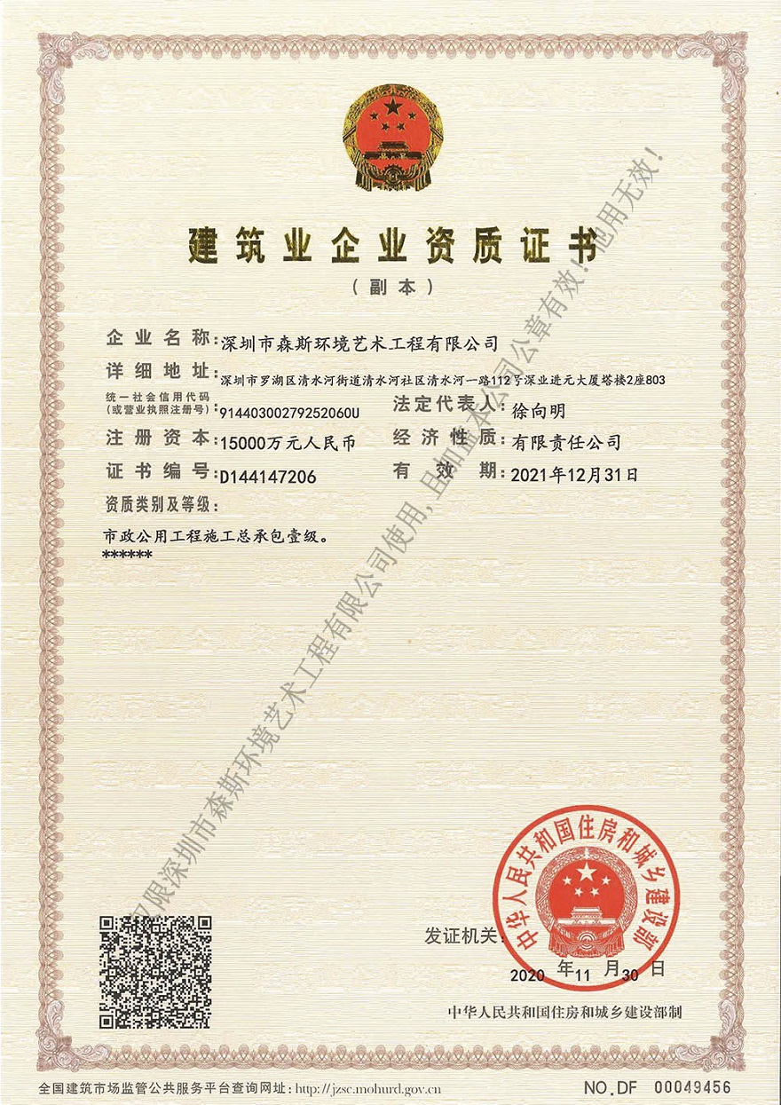 秋風(fēng)過(guò)耳攜喜訊,好事連連笑顏開(kāi)。熱烈祝賀我司成功獲批市政公用工程施工總承包壹級(jí)資質(zhì)。市政施工資質(zhì)的成功升級(jí),是對(duì)深圳市森斯環(huán)境藝術(shù)工程有限公司(簡(jiǎn)稱森斯環(huán)境)的企業(yè)資信能力、企業(yè)主要管理人員和專業(yè)技術(shù)人員要求、技術(shù)裝備、企業(yè)工程業(yè)績(jī)的認(rèn)可和見(jiàn)證。同時(shí),為公司進(jìn)一步完善業(yè)務(wù)經(jīng)營(yíng)領(lǐng)域,拓展市政施工總承包業(yè)務(wù)提供助力,推動(dòng)公司創(chuàng)新發(fā)展戰(zhàn)略目標(biāo)的實(shí)現(xiàn)。