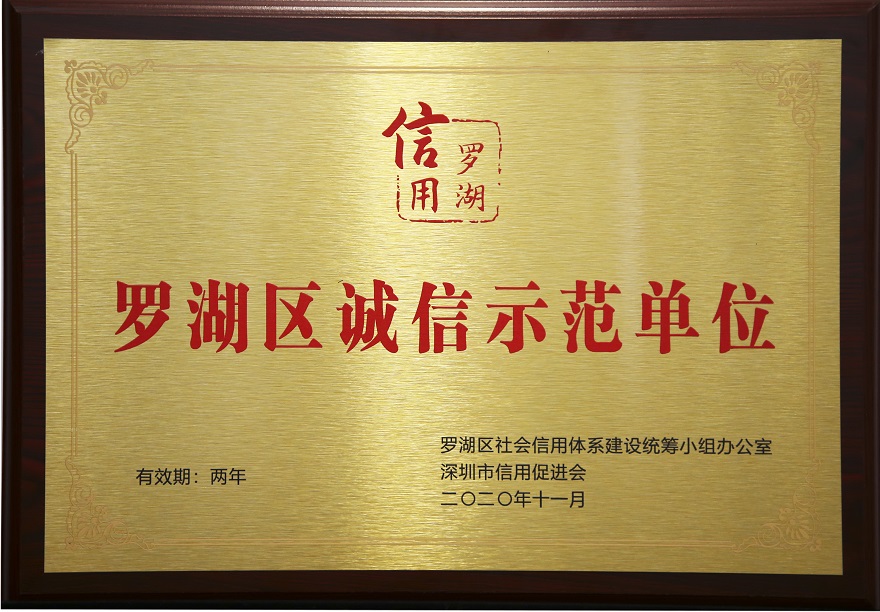 據羅湖區信用辦《關于開展羅湖區誠信示范單位創建活動的通知》和《關于開展羅湖區社會信用建設典型案例征集評選活動的通知》,經專家評審、公示等環節,我司最終獲評“羅湖區誠信示范單位”稱號。