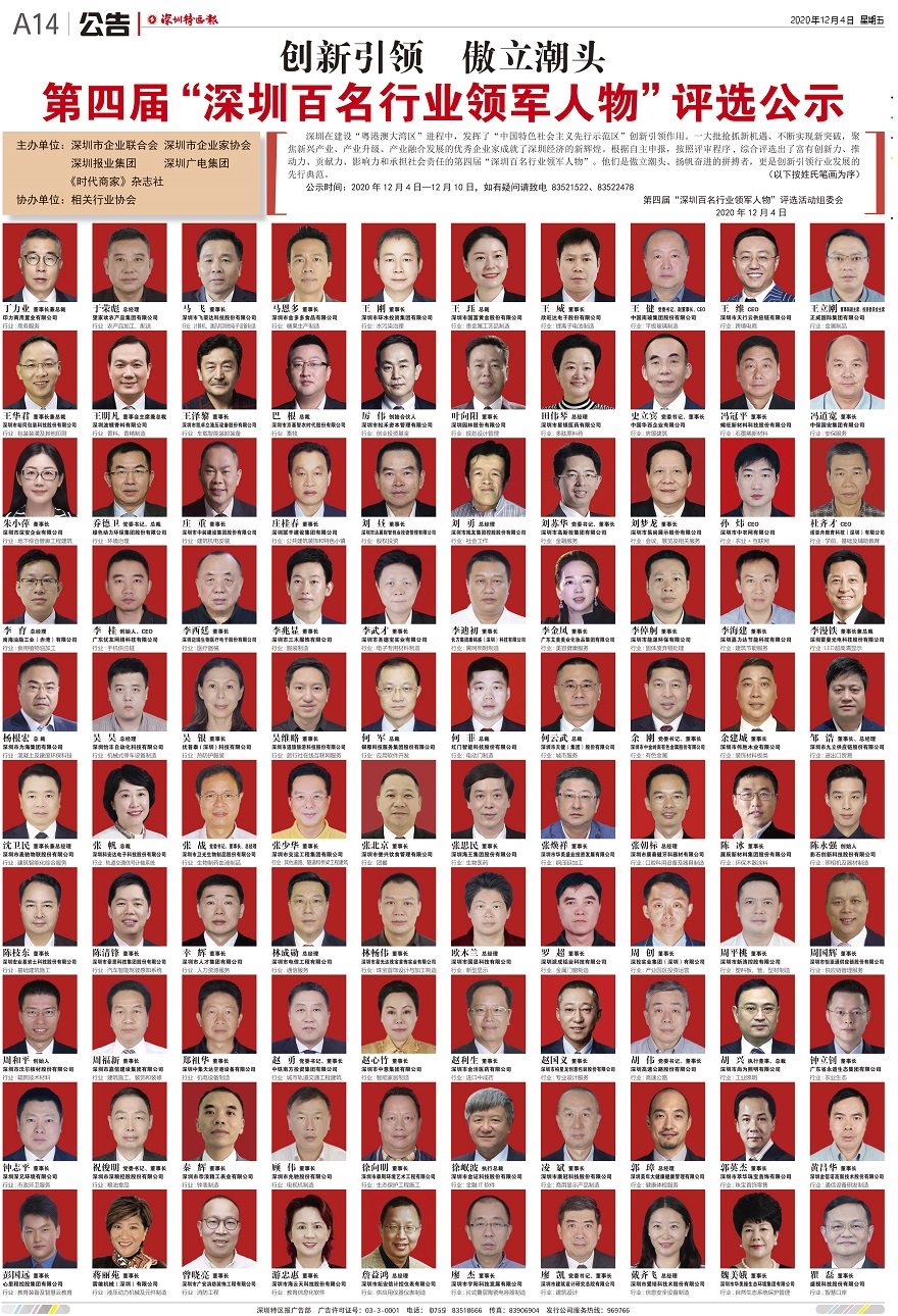 自2011年首屆“深圳百名行業領軍人物”評選活動成功舉辦以來,每3年評選一屆,已連續舉辦了三屆。受到了政府的高度重視和肯定,更在深圳企業界和企業家中產生了廣泛而深遠的影響。為發掘更多的行業領軍人物,激勵更多的企業家聚焦新時期、踏上新征程、采取新舉措、搶抓新機遇、達成新目標,深圳市企業聯合會、深圳市企業家協會協同相關行業協會、相關權威媒體等共同組織第四屆“深圳百名行業領軍人物”評選。
