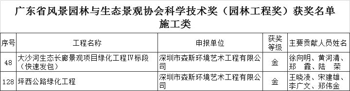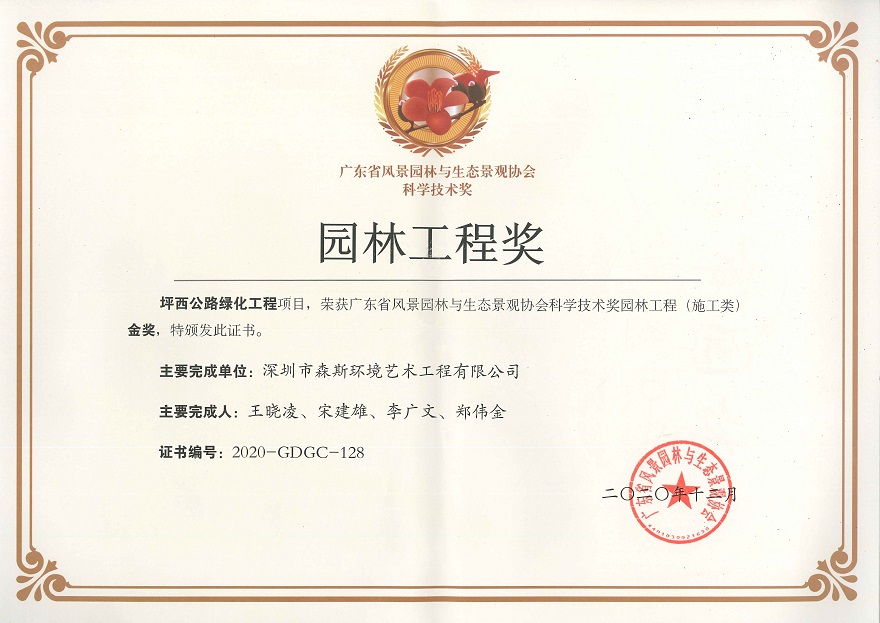 2020年度廣東省風景園林與生態景觀協會科學技術獎(園林工程獎)評審結果已公示,森斯環境承建的“坪西公路綠化工程項目”、“大沙河生態長廊景觀項目綠化工程IV標段(快速發包)項目”榮獲廣東省風景園林與生態景觀協會科學技術獎園林工程(施工類)金獎,森斯環境實力再獲權威肯定!