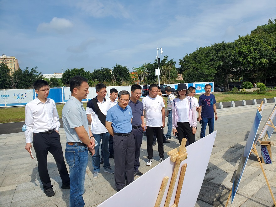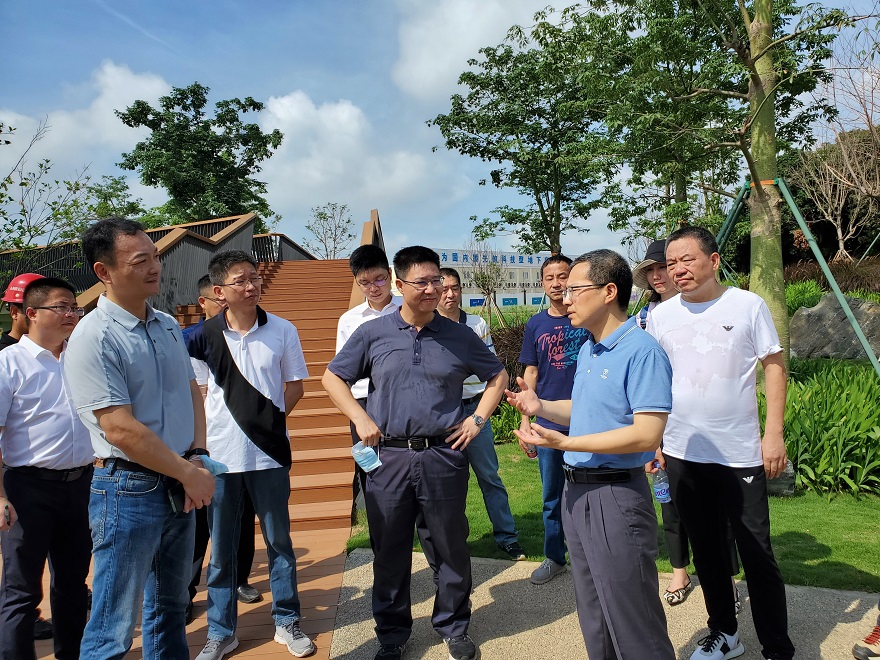 ▲光明區(qū)委書(shū)記劉勝一行在同觀濕地公園聽(tīng)取茅洲河一河兩岸建設(shè)情況匯報(bào)