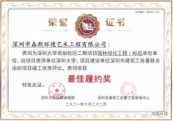 森斯環(huán)境承建了該項(xiàng)目I標(biāo)段園林綠化工程,無(wú)論是進(jìn)度、質(zhì)量、安全文明,還是最終的展示效果,都得到了深圳大學(xué)、深圳市建筑工務(wù)署以及參建各方的一致好評(píng)。森斯環(huán)境榮獲了團(tuán)體最高榮譽(yù)“最佳履約獎(jiǎng)”,生產(chǎn)經(jīng)理黃河清榮獲“突出貢獻(xiàn)獎(jiǎng)”,執(zhí)行經(jīng)理寇正平榮獲“優(yōu)秀標(biāo)兵”等三項(xiàng)大獎(jiǎng)。