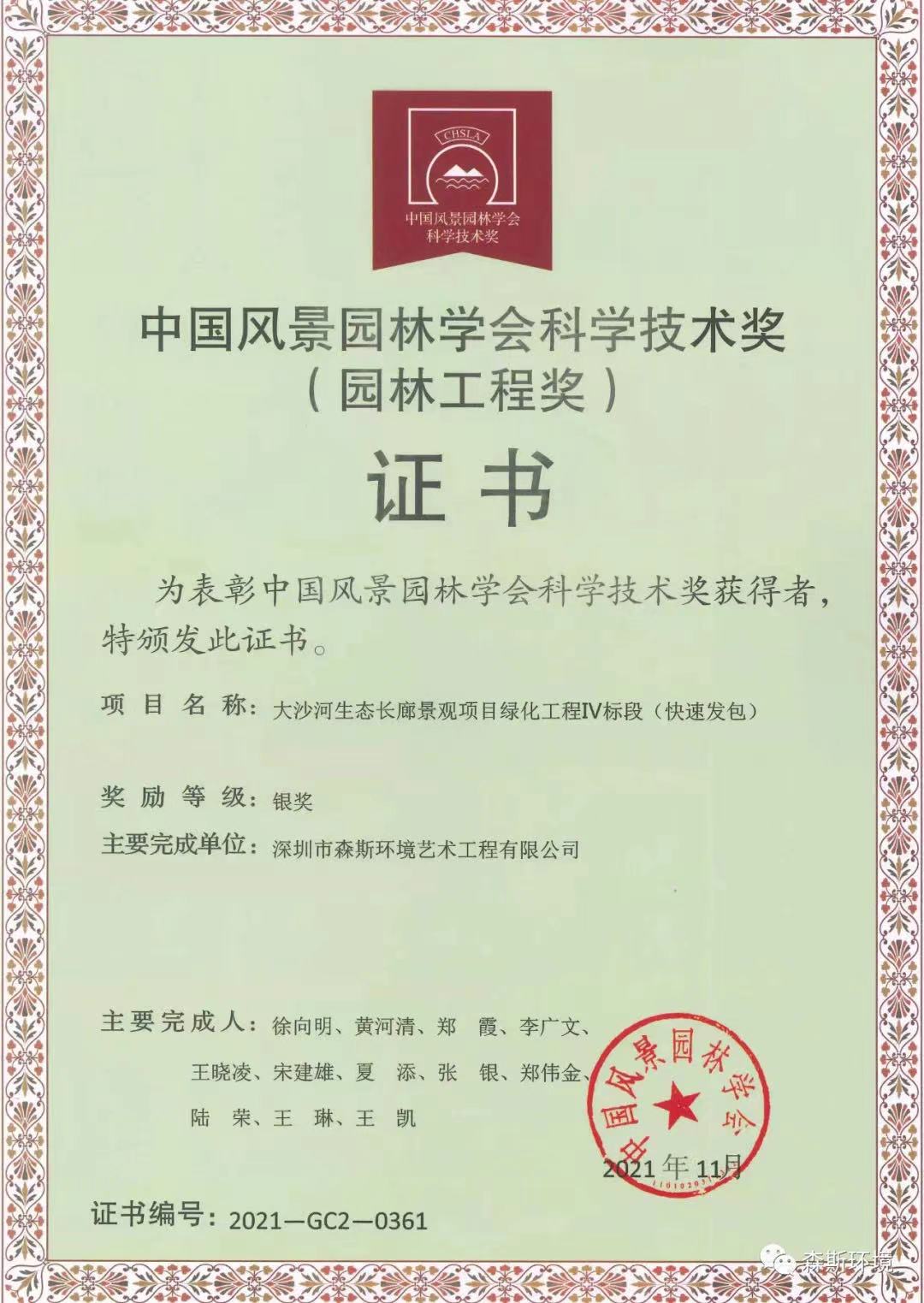 1221日,中國風景園林學會發布了2021年度科學技術獎(園林工程獎)深圳市森斯環境藝術工程有限公司施工的大沙河生態長廊景觀項目綠化工程IV標段(快速發包)項目榜上有名,充分展現了企業在工程施工方面的綜合實力及創新能力。