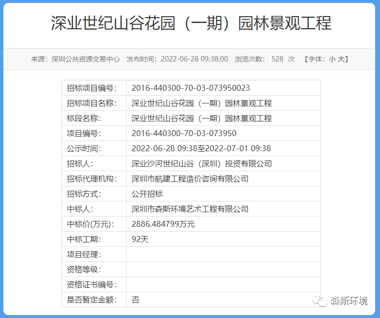 中標(biāo)喜訊 | 森斯環(huán)境中標(biāo)深業(yè)世紀(jì)山谷花園(一期)園林景觀工程