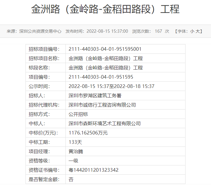 近日,深圳市森斯環境藝術工程有限公司成功中標金洲路(金嶺路-金稻田路段)工程。