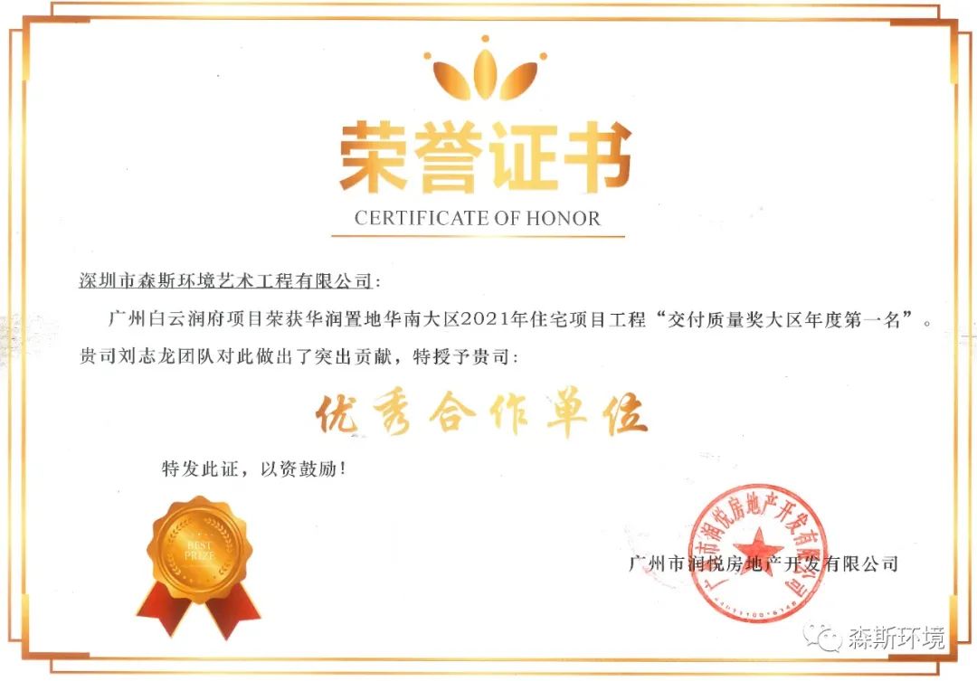 近日,我司收到華潤置地所屬廣州市潤悅房地產開發有限公司頒發的榮譽證書,潤悅房地產對我司施工的“華潤廣州白云潤府項目園林景觀工程”榮獲華潤置地華南大區2021年住宅項目工程“交付質量獎大區年度第一名”提出表揚并授予“優秀合作單位”。同時該項目的合同履約被評為“優秀”等級。