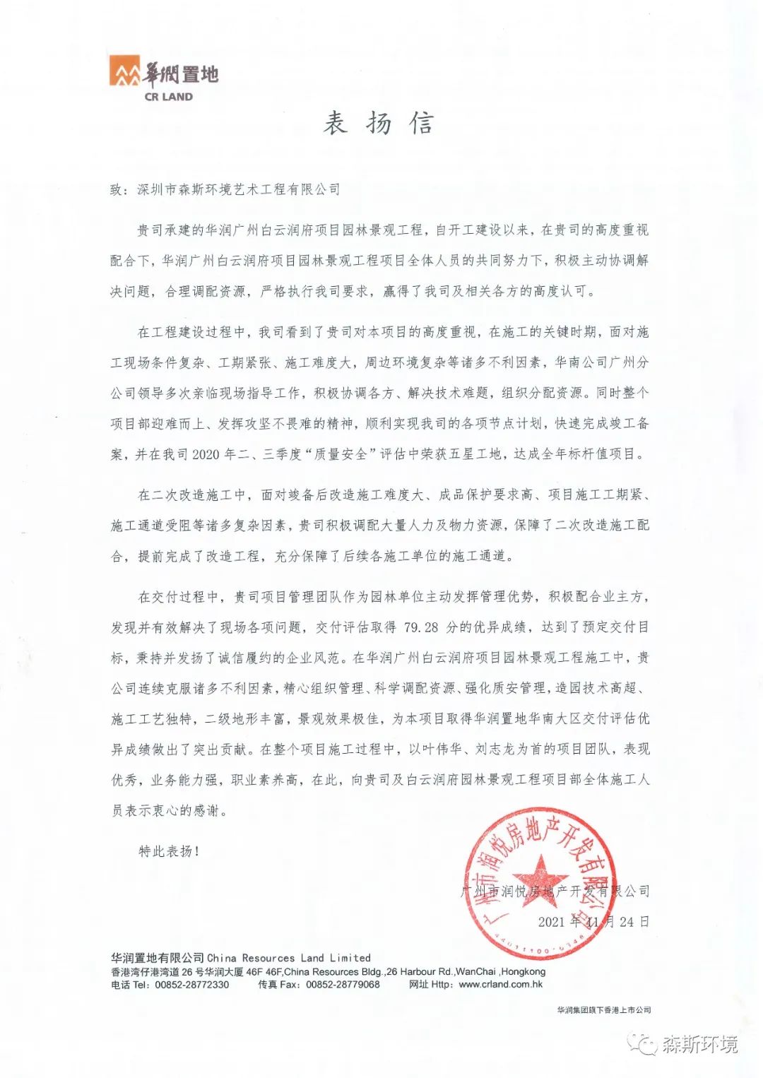 這充分體現了華潤置地以及廣州市潤悅房地產開發有限公司對森斯環境工作的肯定。我們定將不負厚望,繼續秉持“誠信履約、品質至上”的理念,積極響應華潤實施高品質戰略的要求,努力打造城市精品工程,樹立行業標桿。