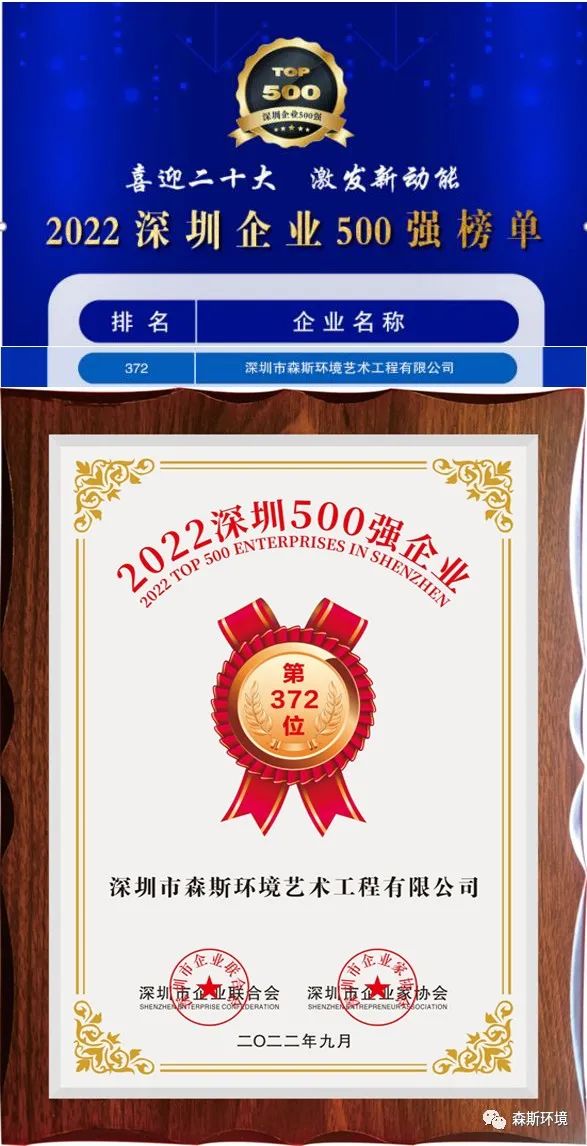 9月21日,深圳市企業(yè)聯(lián)合會、深圳市企業(yè)家協(xié)會正式發(fā)布“2022深圳企業(yè)500強(qiáng)榜單”及《2022深圳500強(qiáng)企業(yè)發(fā)展報(bào)告》。中國平安保險(xiǎn)(集團(tuán))股份有限公司、正威國際集團(tuán)有限公司、華為投資控股有限公司,位列“2022深圳企業(yè)500強(qiáng)榜單”前三名。深圳市森斯環(huán)境藝術(shù)工程有限公司列第372位,繼2021年后再次上榜 “深圳500強(qiáng)企業(yè)”榜單。