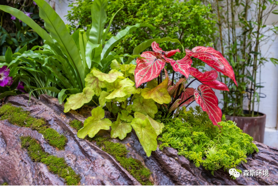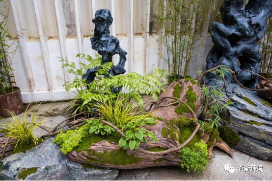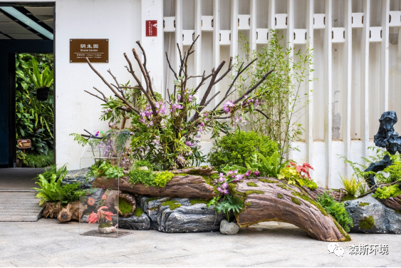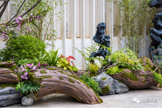 “夢回自然”設計采用了園林中常用的借景手法將陰生園的花墻借了過來,配置具有“瘦、皺、漏、透”特點的“太湖石”、順墻延伸的枯木上點綴著生機盎然的苔蘚以及蕨類植物和鮮花,體現枯木逢春,自然生長的感覺。花園設計與周邊環境相結合,錯落有致,營造出“雖由人作、宛自天開”的感覺,讓大自然的景色躍然于”容器”之上。