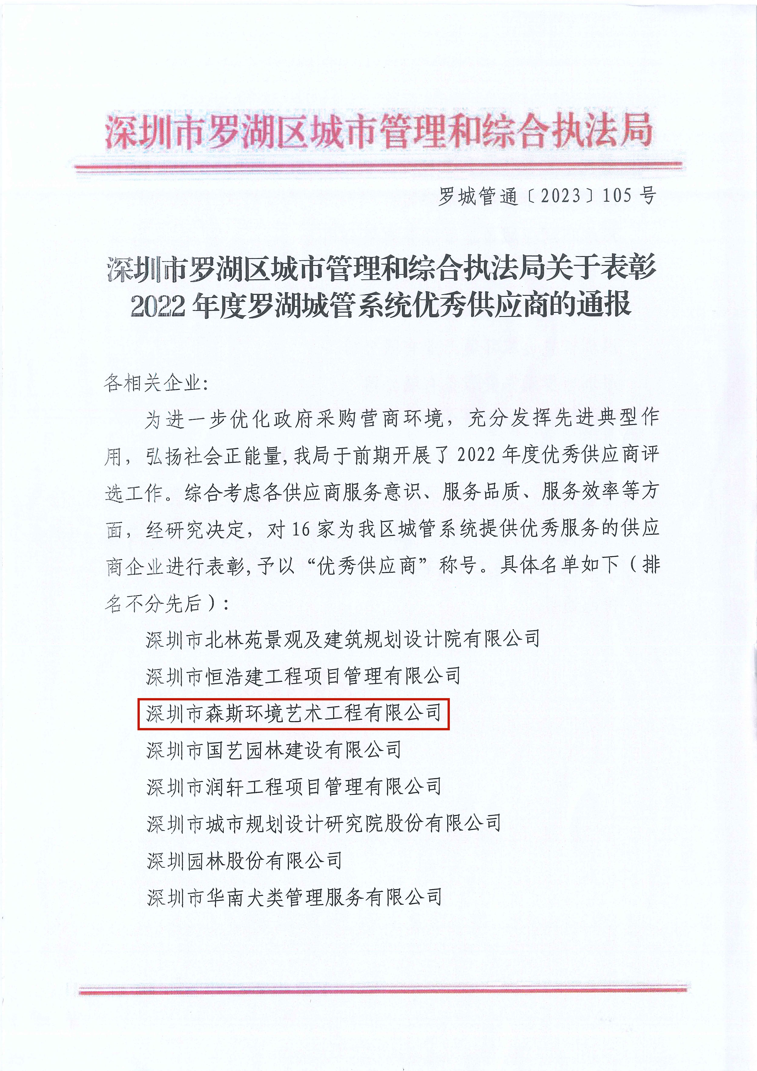 近期,深圳市羅湖區城市管理和綜合執法局開展了2022年度優秀供應商的評選工作,深圳市森斯環境藝術工程有限公司憑借其優異的服務意識、服務品質和服務效率順利入選并被評為:2022年度羅湖城管系統“優秀供應商”!