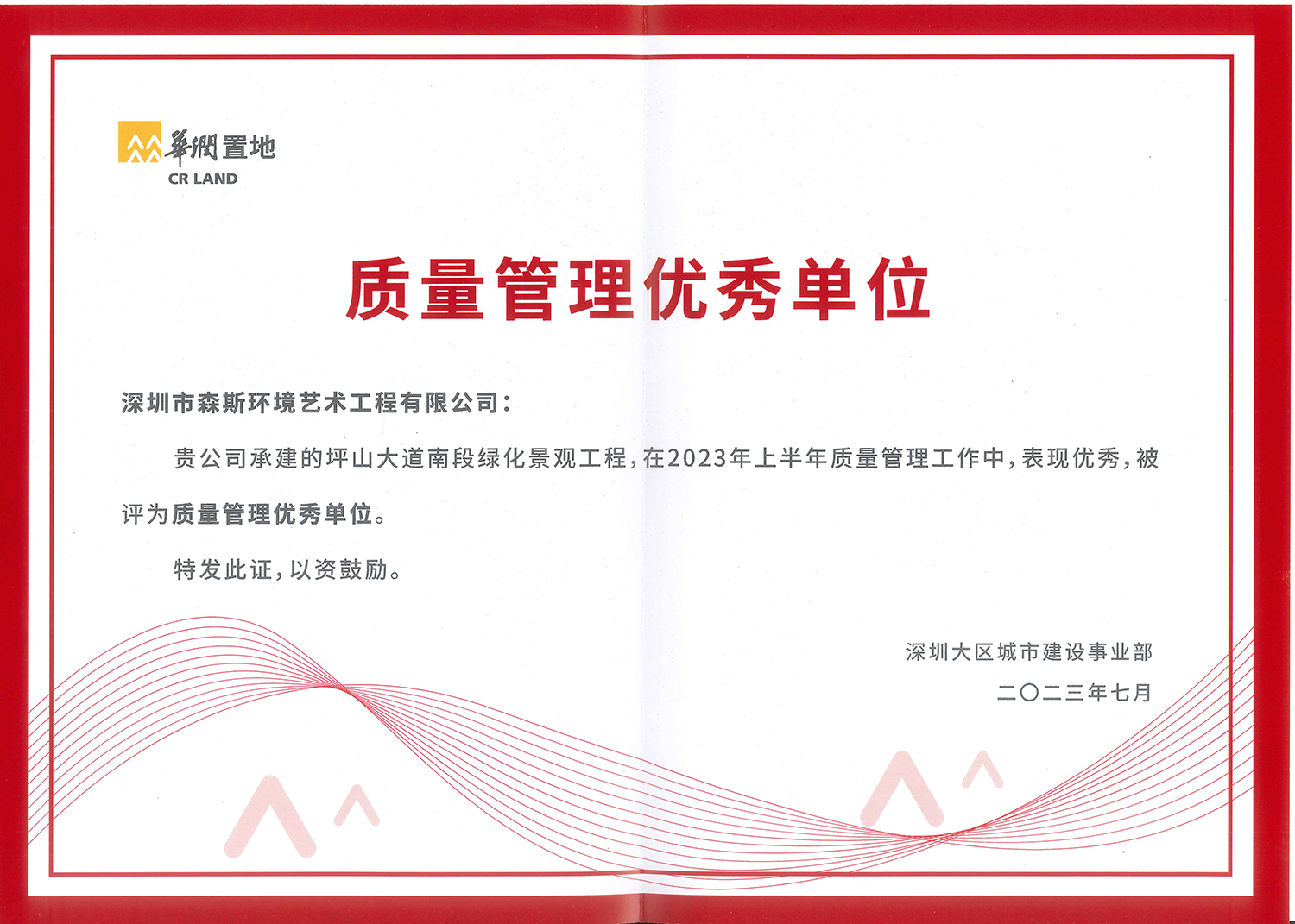 喜訊 | 森斯環(huán)境榮獲華潤置地“質(zhì)量管理優(yōu)秀單位”稱號