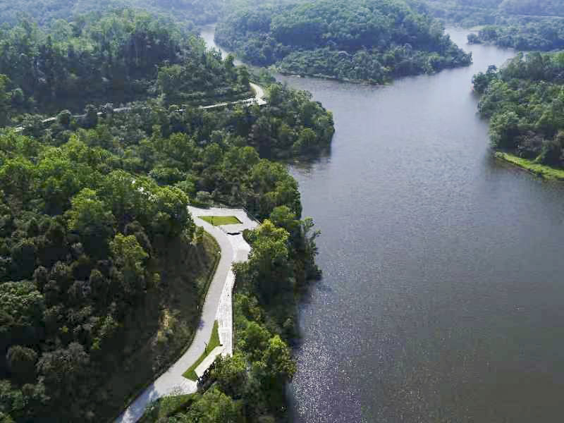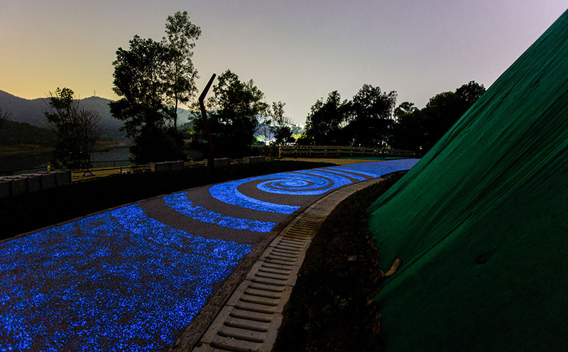 本項目長6.2公里,突出自然之美,在山坡上種植了大片的毛杜鵑,每年4、5月份花開之時,映照在水面之上呈現出“山花開似錦,澗水湛如藍”的迷人風光。在創新嘗試上,建設了一條全長800多米星空綠道,由進口發光材料鋪設而成,發光顆粒在白天吸收光能,儲存能量,天黑后點點光芒能組成星空、星河、星云、漩渦四種主題發光圖樣,形成一條浪漫的夜光步道。項目的建成有效連接和維護綠色生態廊道,打造出一條自然與城市交互串聯、彰顯山林生態與城市文明的休閑綠道。