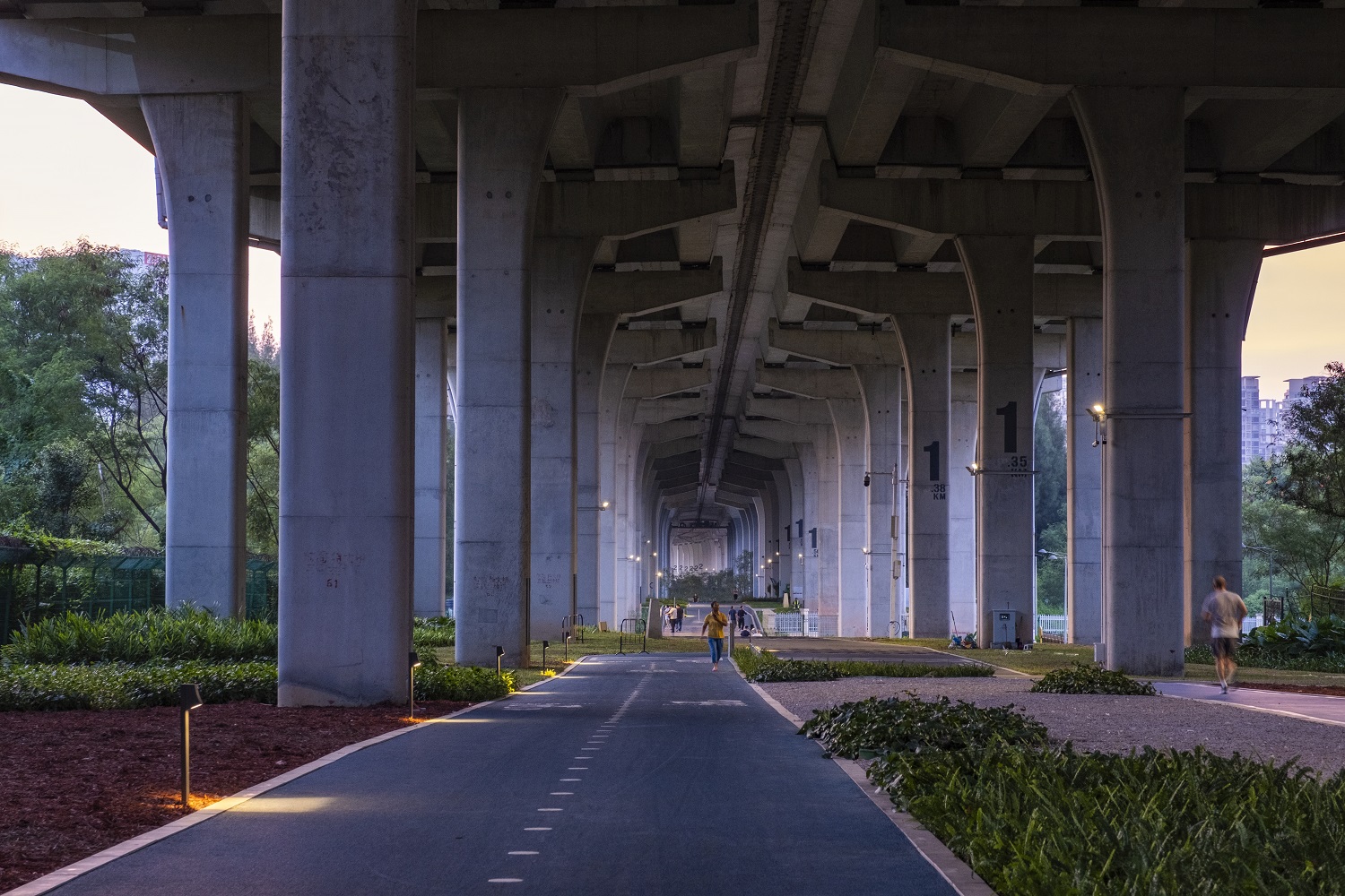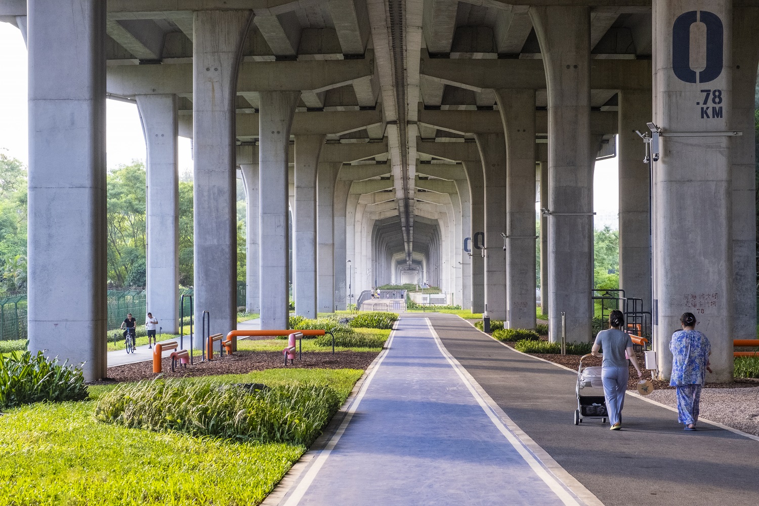 本項(xiàng)目北接金灣大道,南止歡樂港灣,全線位于廣深沿江高速橋下,全長6km,景觀建設(shè)面積37萬㎡,主要建設(shè)內(nèi)容包括人行道、慢跑道、自行車道、配套設(shè)施、環(huán)境提升等,是前海擴(kuò)區(qū)后落實(shí)深圳市“山海連城計劃”的重要舉措。作為一個全齡友好的綜合性“多元橋下空間”,西灣-前海灣慢行道設(shè)置了騎行道、人行道、跑步道三種道路,提供了科普教育、兒童游樂、運(yùn)動健身等豐富的休閑場所,有效拓展了城市的發(fā)展空間,更成為市民共享美好生活的“民生紐帶”。
