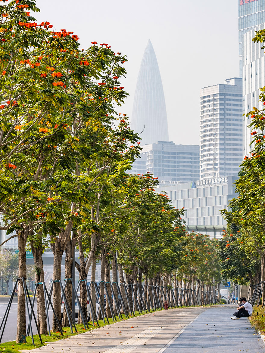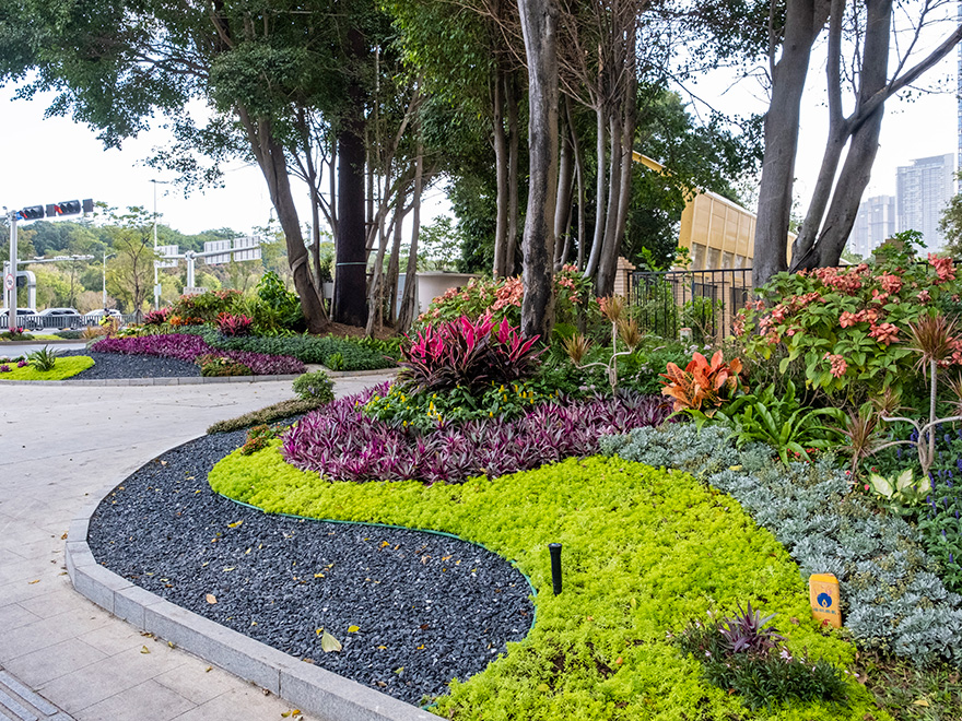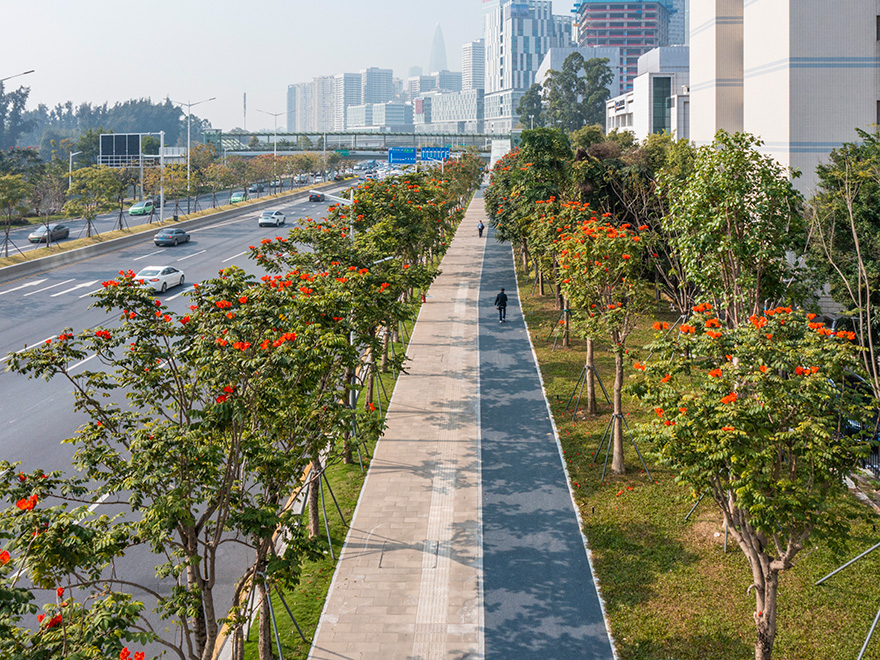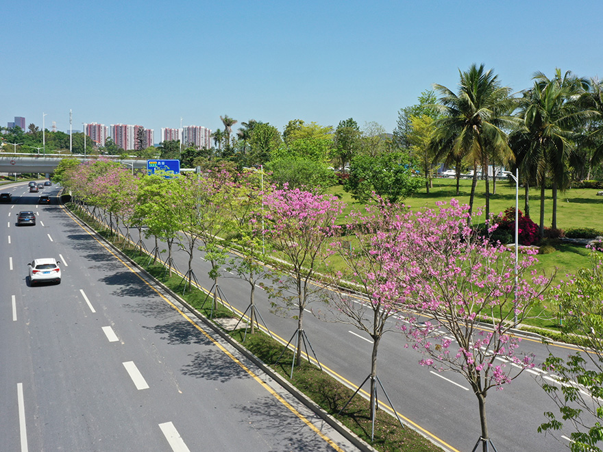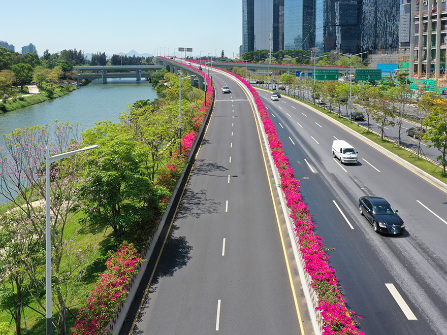 本項目為深圳市南山區年度重點市政工程,改造范圍自高新南九道至茶光路,全長4.53公里,綠化面積12.6萬平方米,全線采用火焰木、紫花風鈴木、無憂樹等作為行道樹布置,大膽引進北美觀葉喬木娜塔櫟進行種植,兩側綠化帶運用“二級地形”手法,配置了彩色花木和大面積草地,植物組團飽滿、留白通透、線條流暢、微地形豐富;在茶光路節點及沿線,配置了植物品種多樣、層次豐富的花境,形成一條綠廊花海,使沙河西路變成花卉景觀大道,成為了市民爭相觀賞的城市園林景觀帶。