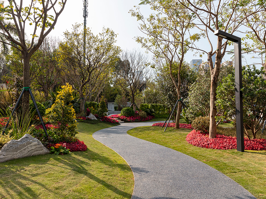 花園面積約3000平方米,使用了曲線元素進(jìn)行空間組織,通過蜿蜒的園路平臺(tái)、綠化微地形構(gòu)建動(dòng)靜分明、流暢圓潤的總體布局,為社區(qū)居民打造輕松舒適的休閑環(huán)境。在各出入口及園路交接口運(yùn)用花境布置手法,點(diǎn)亮關(guān)鍵節(jié)點(diǎn),塑造出視覺鮮明的街心花園形象。