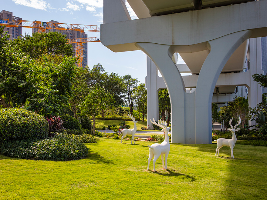 綠化恢復(fù)長2.3公里、面積6.8萬平方米,全線采用鳳凰木、鐵冬青作為行道樹布置,中央綠化帶運(yùn)用“二級地形”手法,配置了彩色花木和大面積草地,植物組團(tuán)飽滿、留白通透、線條流暢、微地形豐富。在鳳凰城地鐵站橋下采用微地形草坪+白卵石手法,以臺灣草為主的綠色組團(tuán),白卵石點(diǎn)綴,流暢曲折的線形像一條白色的帶子,纏繞著翡翠般的山巒。恢復(fù)后的綠化成為光明大道一條靚麗的風(fēng)景線。