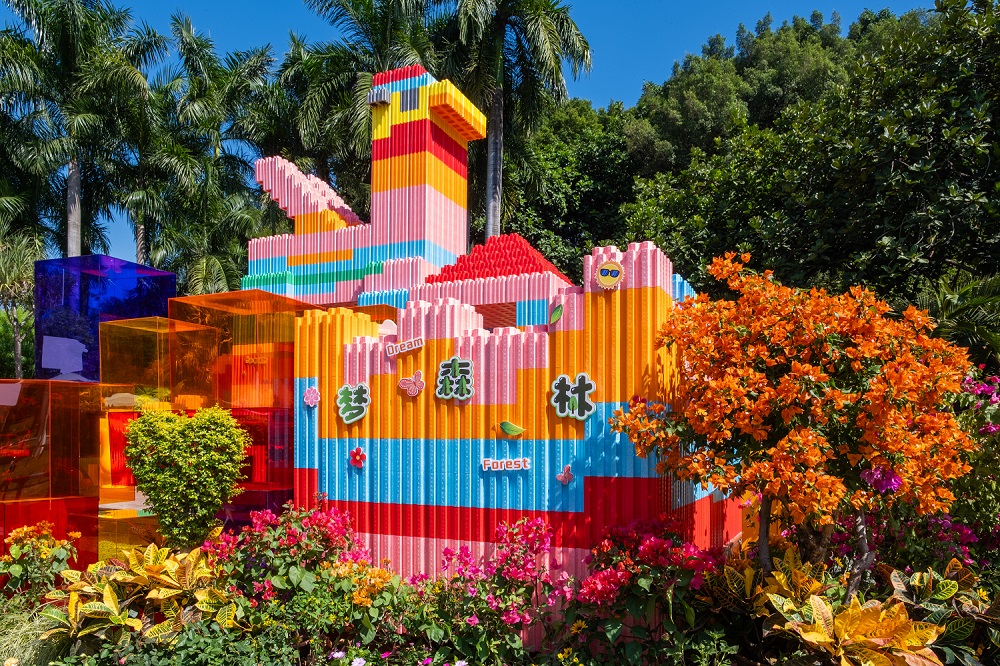 “夢森林”位于蓮花山公園南入口左側大草坪。花園將“夢森林”作為名稱,旨在讓人們在逆境中尋找希望,在彷徨中尋找童心,尋找快樂,尋找最初的夢想。作品采用大量的暖色調,以多巴胺配色激發游人的活力與熱情;由EPP泡沫搭建而成的飛馬佇立中央,詮釋著“以夢為馬,不負韶華”的主題思想;流暢的二級地形配以繽紛的簕杜鵑,鼠尾草、向日葵等花卉爭奇斗艷;絢爛通透的亞克力模塊、五彩斑斕的城墻、夢幻的云朵凳,無不彰顯著童心與歡樂……