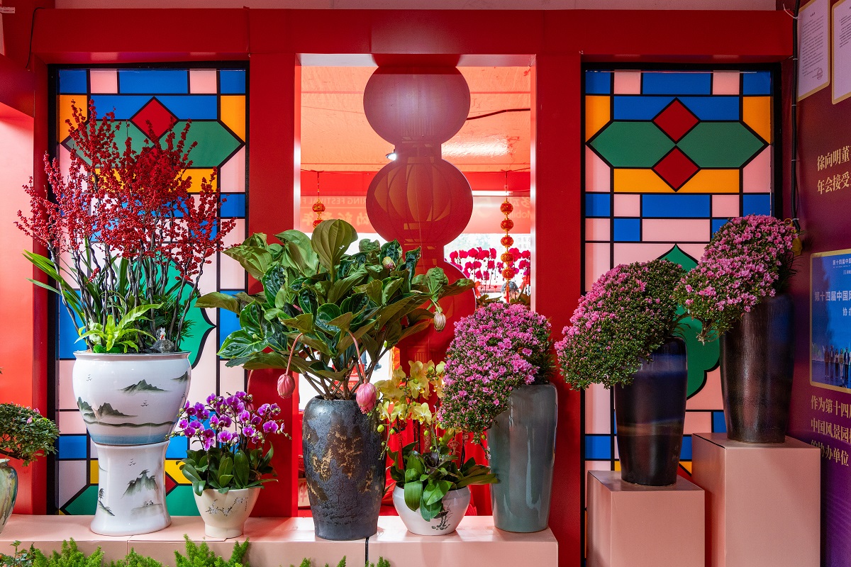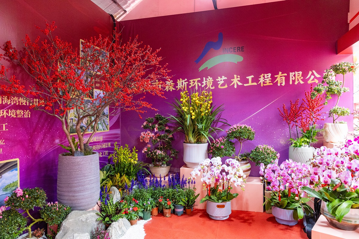 展位采用具有濃郁嶺南特色的坡屋頂,側面配以輕快通暢、玲瓏剔透的彩色透景花窗,粉紫色系花朵編織而成的大型花環佇立正中,歡迎著市民的到來。一盆盆鮮花被精心擺放,構成一幅絢麗的春日畫卷。溫暖似火的北美冬青、雍容華貴的大花惠蘭、貴氣十足的寶蓮燈、優雅從容的蝴蝶蘭……花色豐富,品類繁多,朵朵競相開放,棵棵綠意盎然,獨特的姿態贏得了市民的廣泛喜愛。